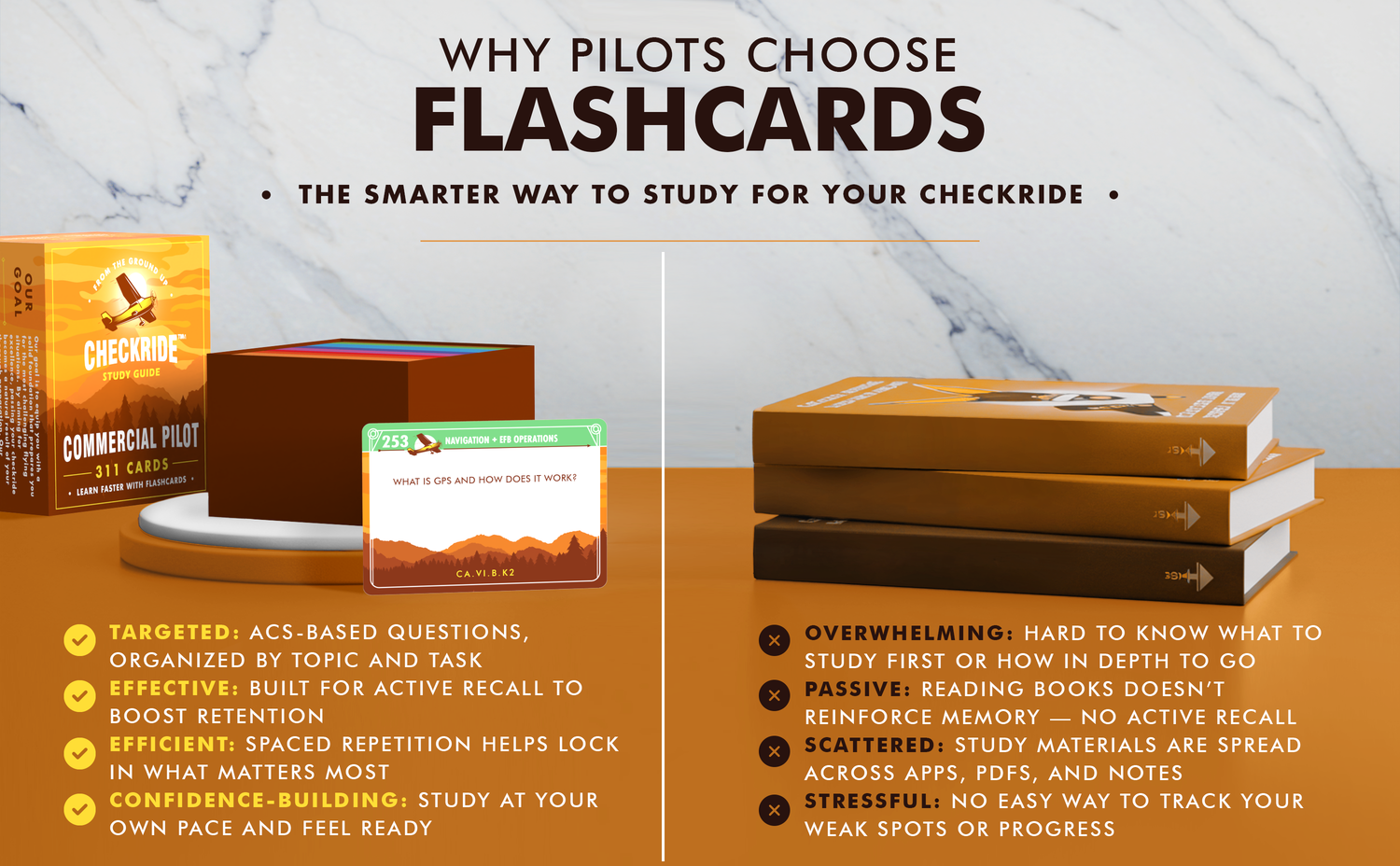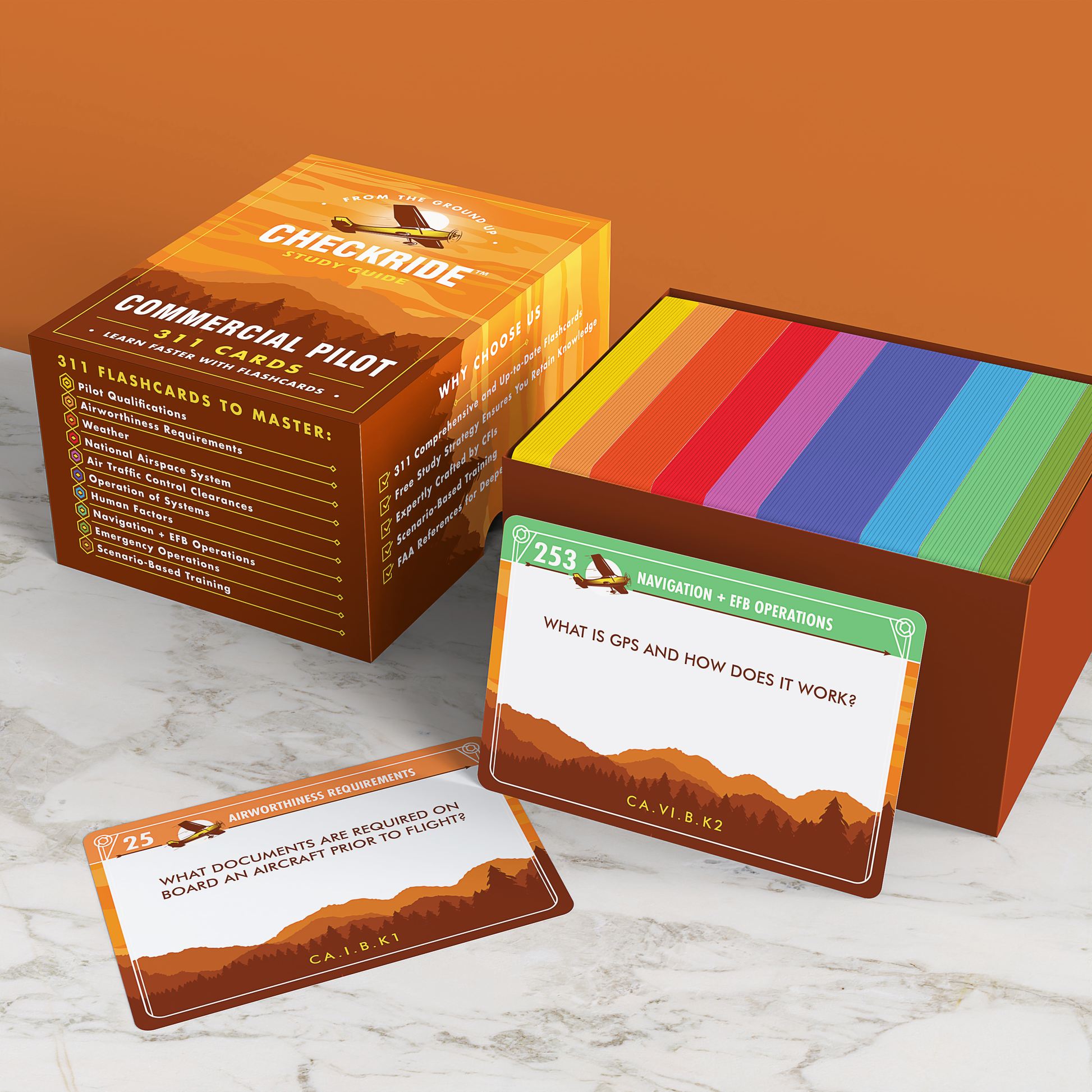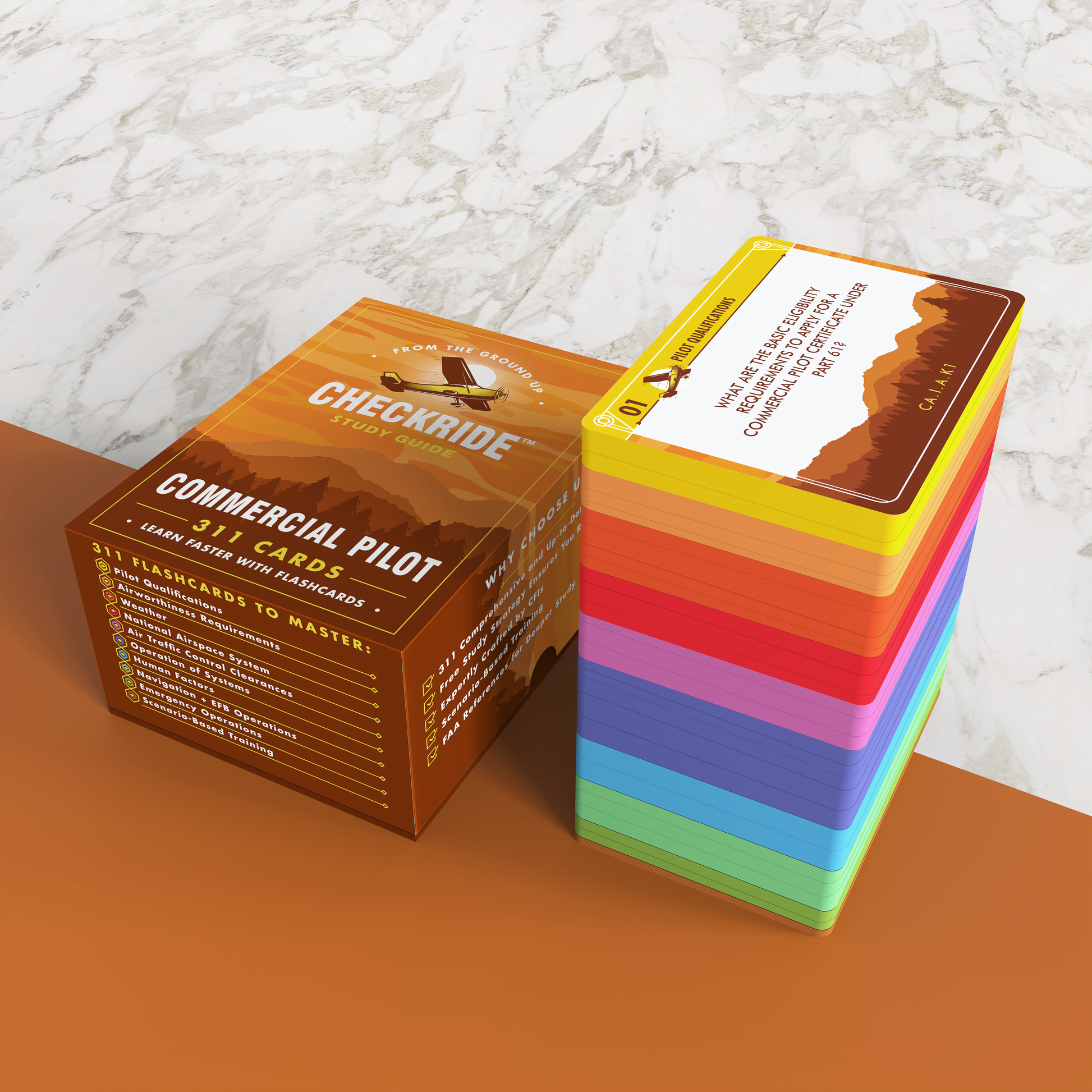 These cards are designed for Private Pilots who are studying for their Commercial Pilot Oral Exam. These flashcards are also great for flight reviews!